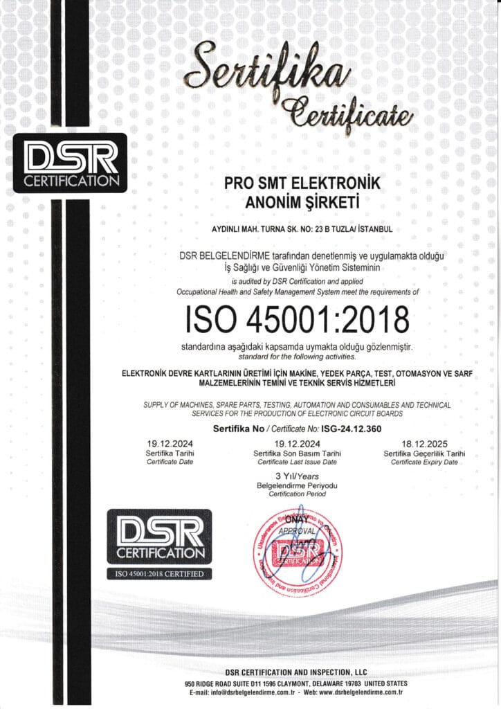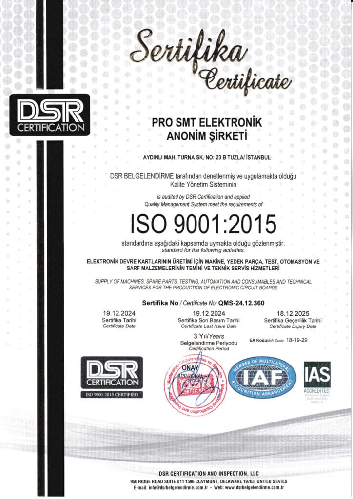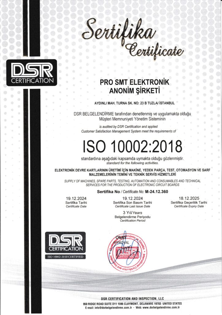 PROSMT KALİTE YÖNETİMİ SERTİFİKALARI ISO 10002 Müşteri Memnuniyeti Yönetim Sistemi Sertifikası ISO 9001 Kalite Yönetim Sistemi Sertifikası ISO 45001 İş Sağlığı ve Güvenliği Yönetim Sistemi Sertifikası ISO 14001 Çevre Yönetim Sistemi Sertifikası